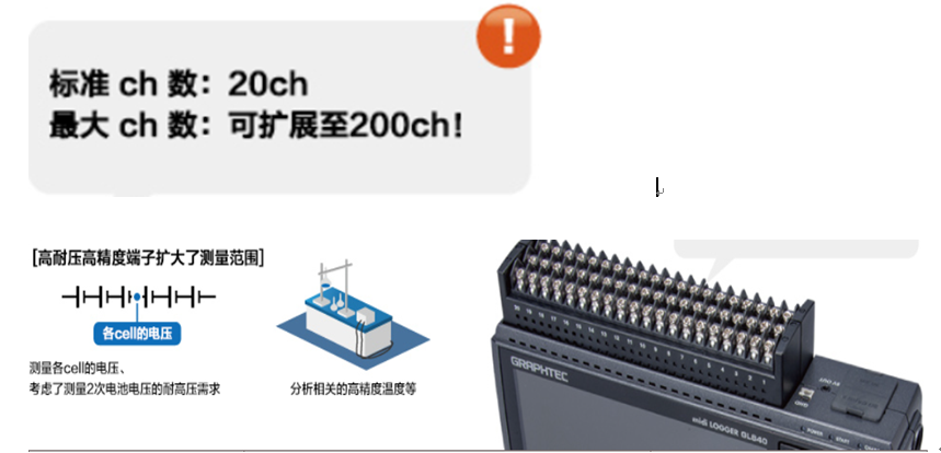 midi LOGGER GL84-0WV C存儲記錄錄儀是一款耐高電壓型記錄儀適用于積層電池包的電壓測定和高精度的溫度測定。標配20個通道,最大可以展到200道,可以同時采樣電流,溫度,濕度,脈沖,邏輯,壓力等物理信號。標配8G的內置,8的內置Flash閃存。機器外接SD卡最大還可以32G存儲空間。采用7寸液晶大屏幕顯示、可以直接在屏幕上顯示實時數據變化曲線和數據列表。記錄數據可保存為GBD(graphtec binary data)格式、CSV格式。GBD格式需要用儀器專用軟件進行查看,CSV格式可以直接用EXCEL打開。