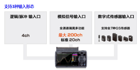 | 支持3種輸入形態  配備了[模擬信號輸入(全通道隔離多功能)][邏輯/脈沖輸入][數字式傳感器輸入口]的3種輸入口、可測量各種各樣的現象。